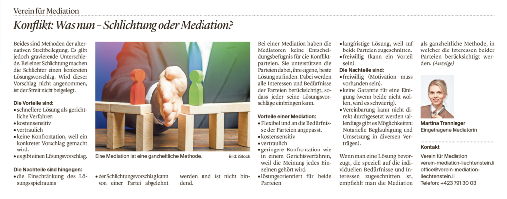 Verein Mediation Liechtenstein hilft Streitigkeiten zu bewältigen 16/03/2019 Das Thema Mediation ist bisher noch viel zu wenig in unseren Alltag integriert – und…